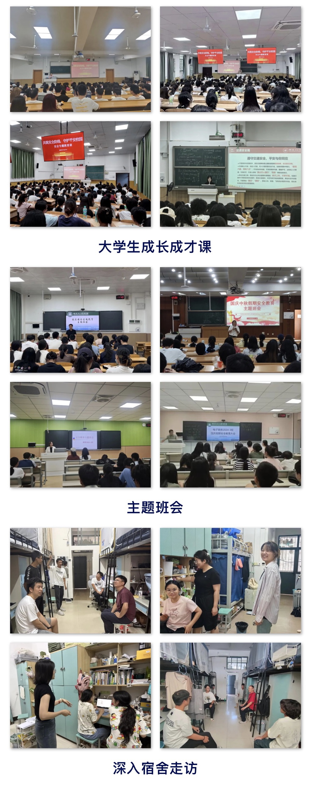 為切實做好國慶、中秋假期安全穩(wěn)定工作,進(jìn)一步增強(qiáng)學(xué)生安全防范意識,營造安全、文明、和諧的校園環(huán)境,學(xué)院于9月25日—30日,通過多種形式開展安全主題教育,為學(xué)生的假期安全保駕護(hù)航。學(xué)院以大學(xué)生成長成才課、主題班會為陣地,重點從假期學(xué)生管理規(guī)定、人身安全、交通安全、財產(chǎn)安全、出行安全、網(wǎng)絡(luò)安全、宿舍安全、飲食安全、防火防盜、電信詐騙、防溺水等方面進(jìn)行教育,切實增強(qiáng)學(xué)生安全防范意識。輔導(dǎo)員、班主任深入宿...